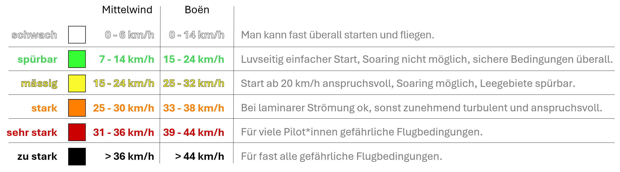 Allgemein lässt sich jedoch sagen, dass Pilot*innen, die ihren A- oder (Low-)B-Schirm im Griff haben, in der Regel sicher fliegen können, wenn der Wind am Start- und Landeplatz schwächer als 20 km/h und in der Luft schwächer als 30 km/h ist, wenn weder Regen noch grossräumig Gewitterwolken auftreten, wenn in den Alpentälern kein Föhn weht (für Flüge in und evtl. nahe der Alpen) und wenn Start- und Landeplatz sowie der Flugweg dazwischen frei von Wolken, Nebel oder Hochnebel sind.