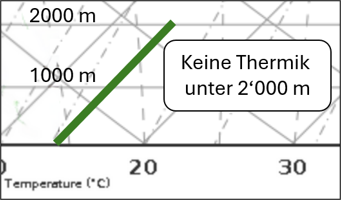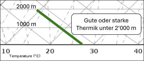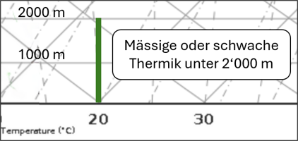 - Previtemps: Vereinfacht gesagt, liegt ein guter thermischer Tag vor, wenn die Temperatur der Atmosphäre auf Flughöhe um 0,7 bis 1 °C pro 100 m abnimmt (die Temperaturlinie im Previtemps ist um 15° bis 45° nach links geneigt), der Wind schwach oder leicht mässig weht und die Luft nicht zu feucht ist. Ideale Bedingungen liegen insbesondere dann vor, wenn trockene Luft oder eine Inversion in grosser Höhe die Bildung von Gewitterwolken erschweren.